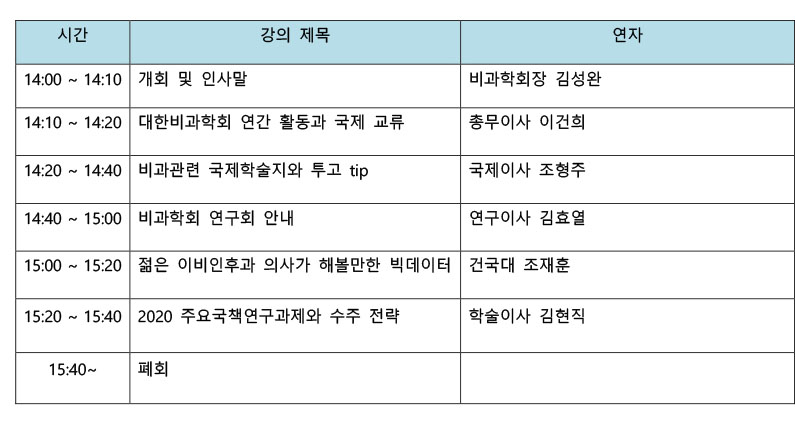 * 대상: 조교수, 전임의 및 봉직의 재직 5년 이내 + 관심 있는 모든 비과학회 회원* 일시: 2020년 7월 11일(토) 오후 2시 온라인( ZOOM 연결방법과 회의 ID 는 추후 공지 예정 )