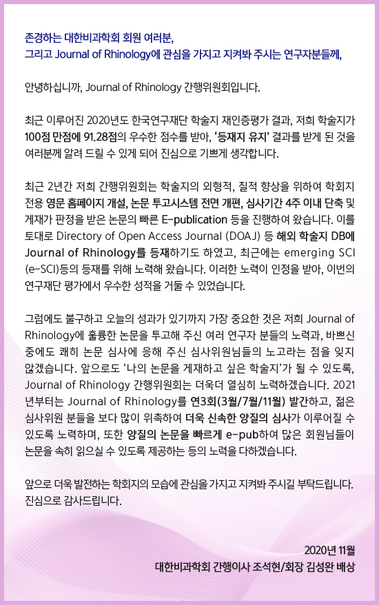 Journal of Rhinology 한국연구재단 등재학술지 유지